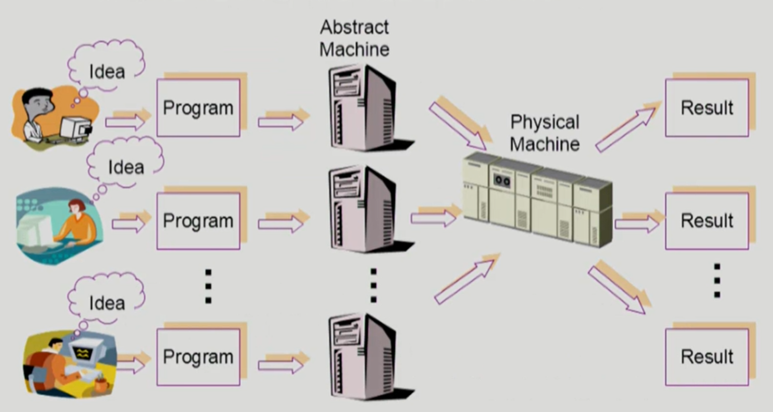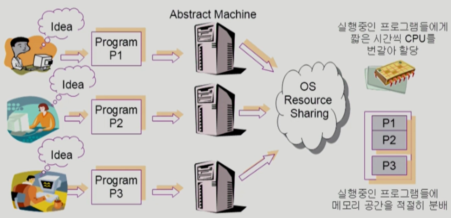 - 운영체제는 동시 사용자 / 프로그램들이 각각 독자적 컴퓨터에서 수행되는 것 같은 환상을 제공