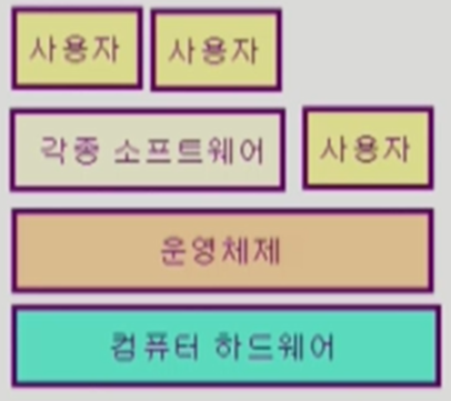 - 컴퓨터 하드웨어 바로 위에 설치되어 사용자 및 다른 모든 소프트웨어와 하드웨어를 연결하는 소프트웨어 계층