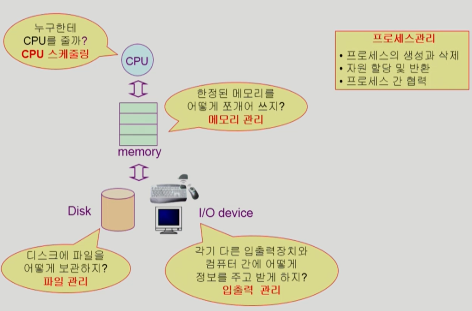 - 프로세서, 기억장치, 입출력 장치 등의 효율적 관리
