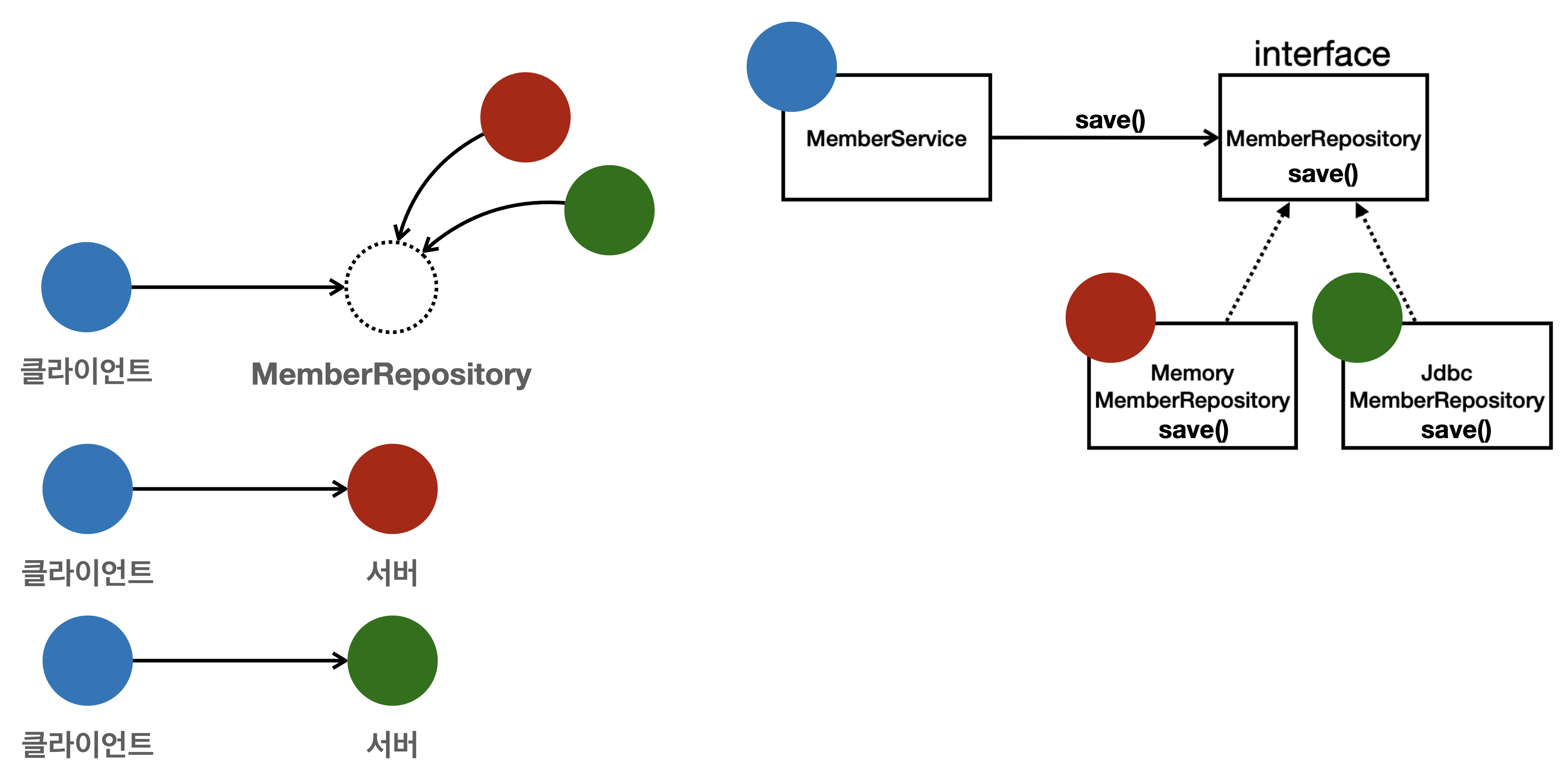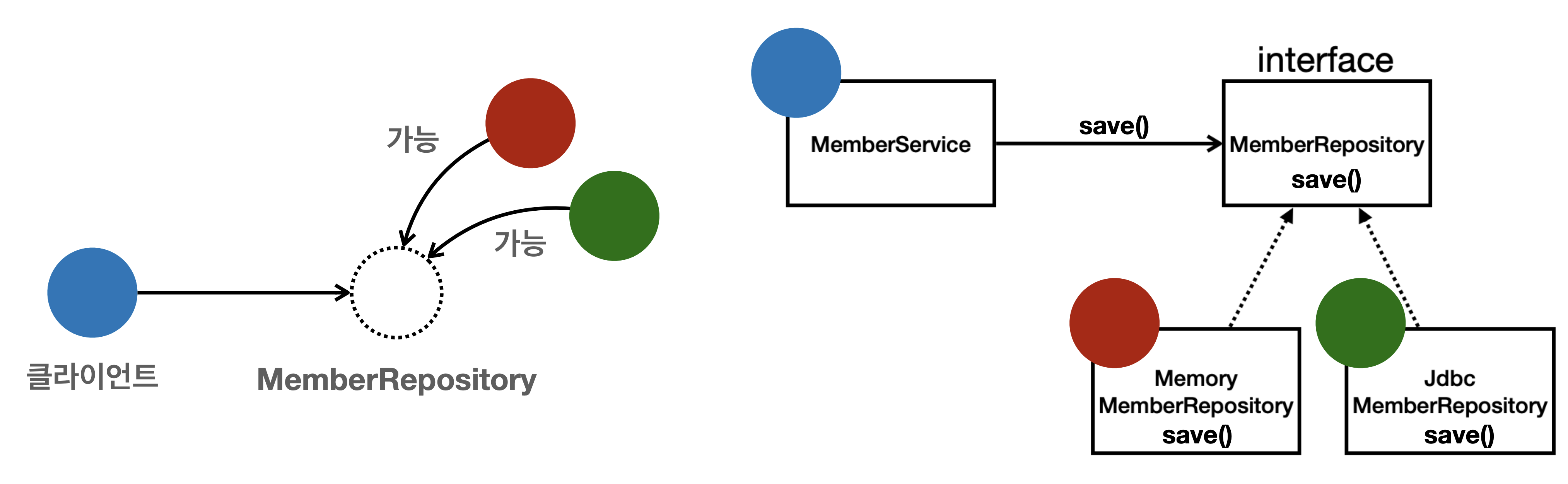 - 구현 = 인터페이스를 구현한 클래스, 구현 객체