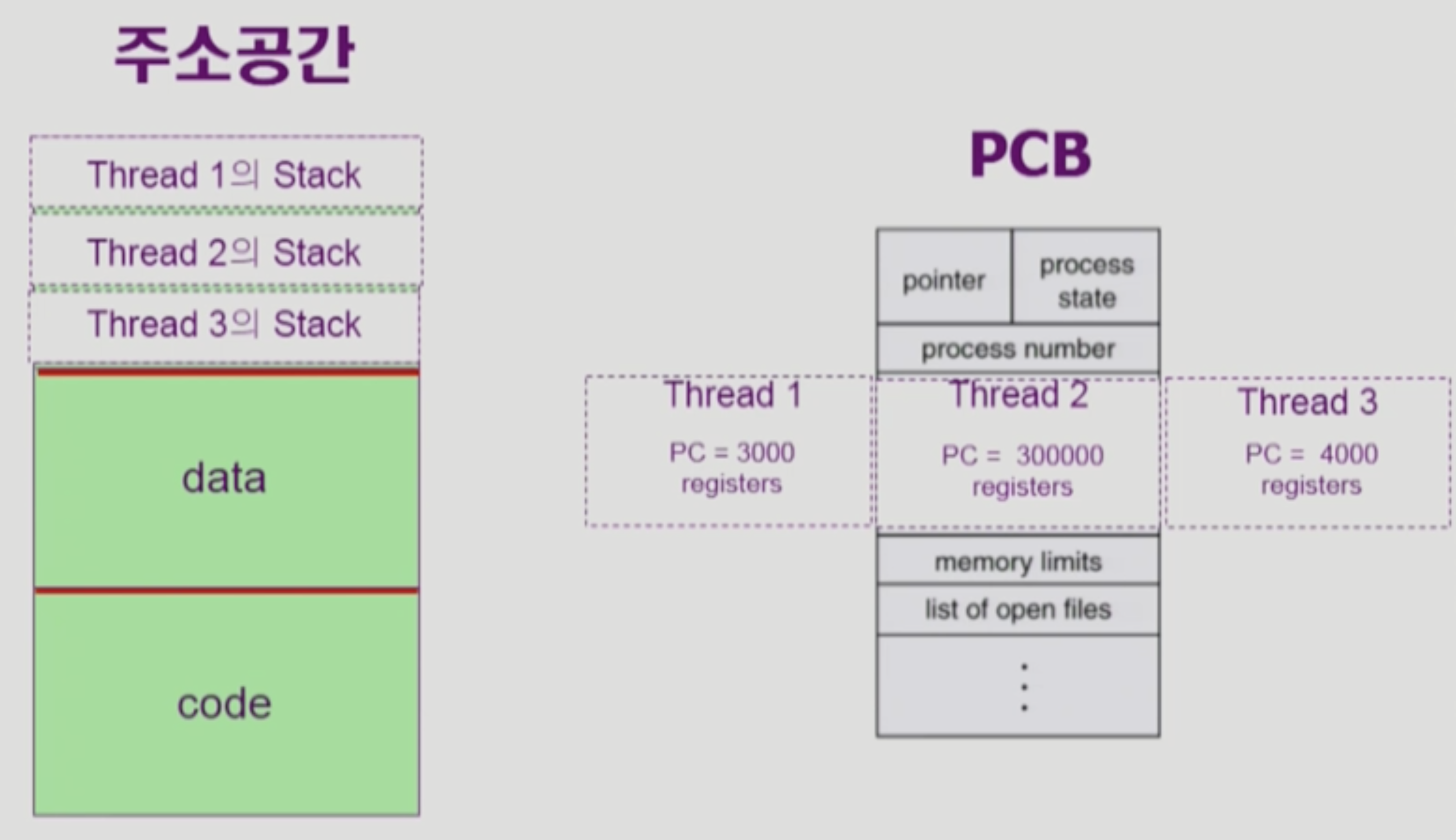 - CPU 수행을 위해서는 PC가 필요하고, 해당 CPU에서 실행하면서 register 저장 공간이 필요하므로 Thread 각각 별도로 유지하고 있다.