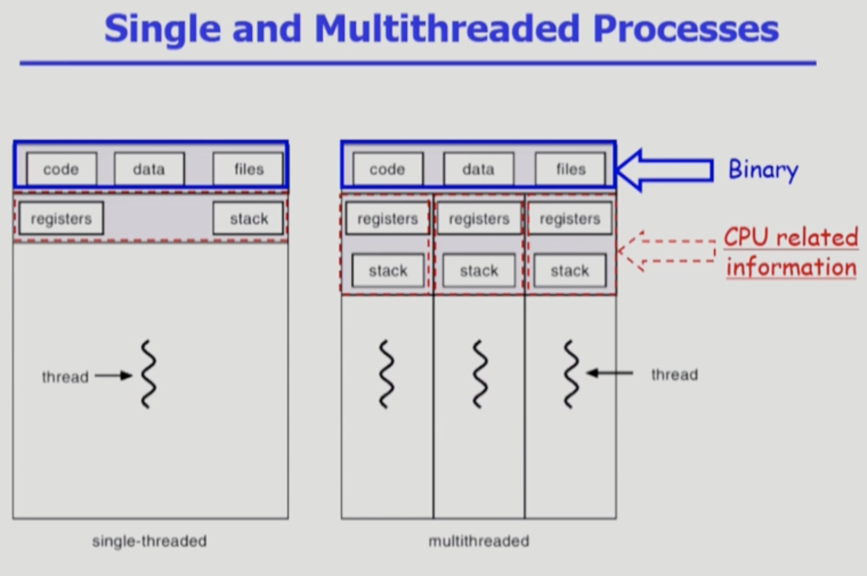 - single thread일 경우 registers, stack은 각각 1개씩 있다.