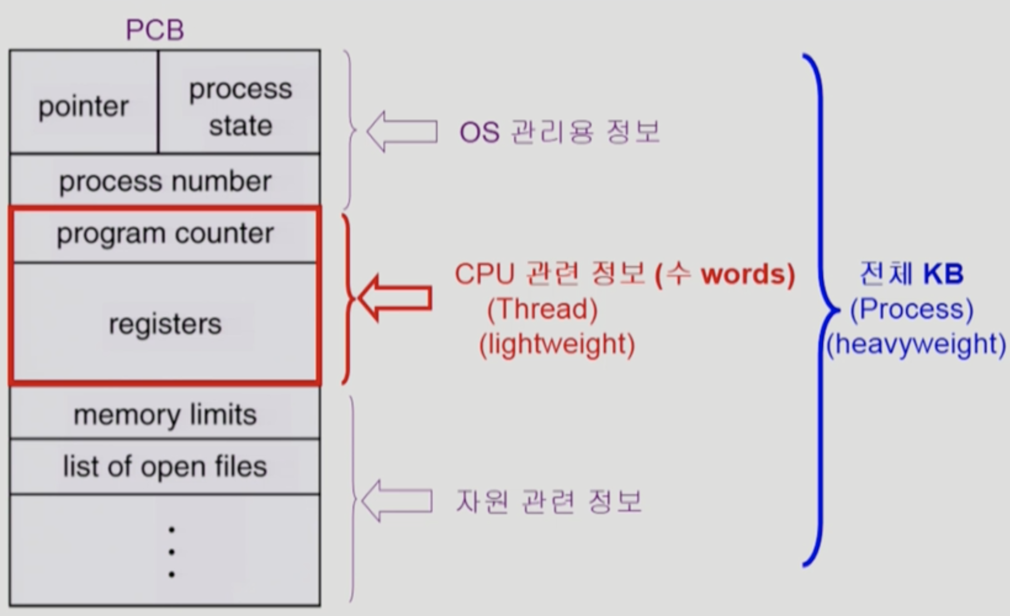 - 그런데 프로세스 안에 스레드가 여러 개 있을 경우 PC, Registers 관련한 정보는 각각 별도의 Copy를 가지고 있게 된다.