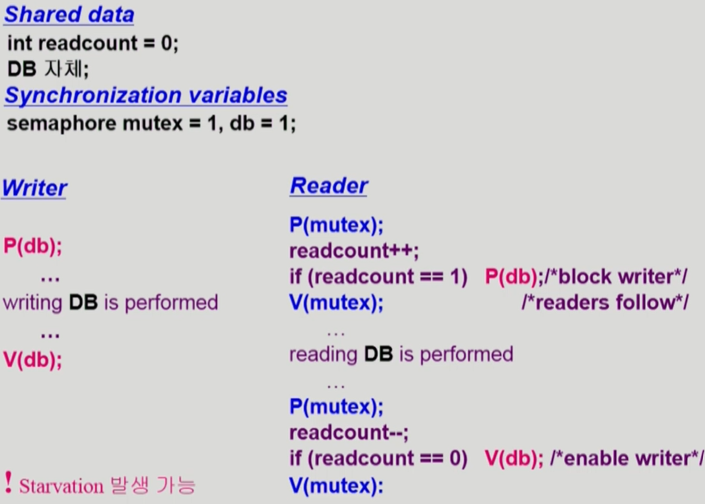 - Writer는 대기 중인 Reader가 하나도 없을 때 DB 접근이 허용된다.