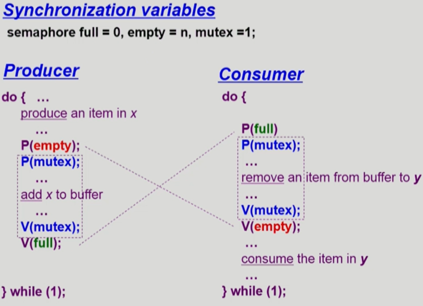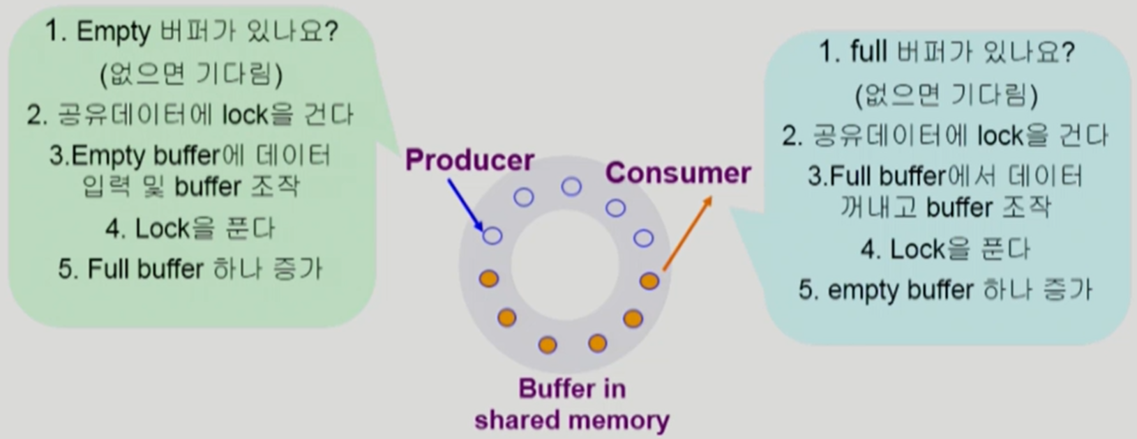 - Need integer semaphore(남은 full / empty buffer의 수 표시)