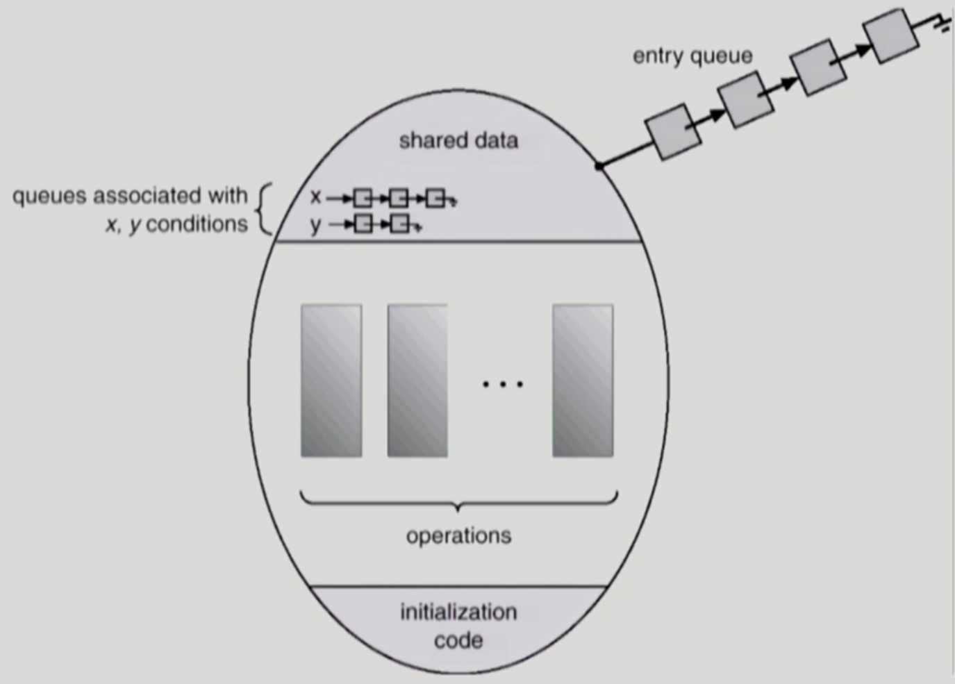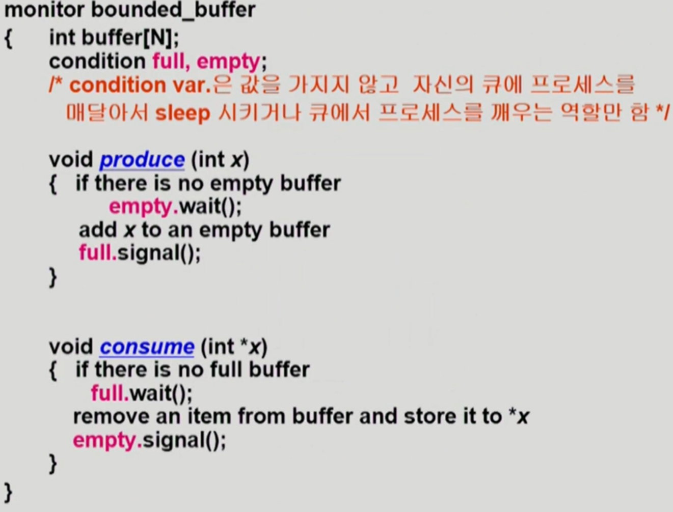 - 프로세스가 모니터 안에서 기다릴 수 있도록 하기 위해 condition variable 사용